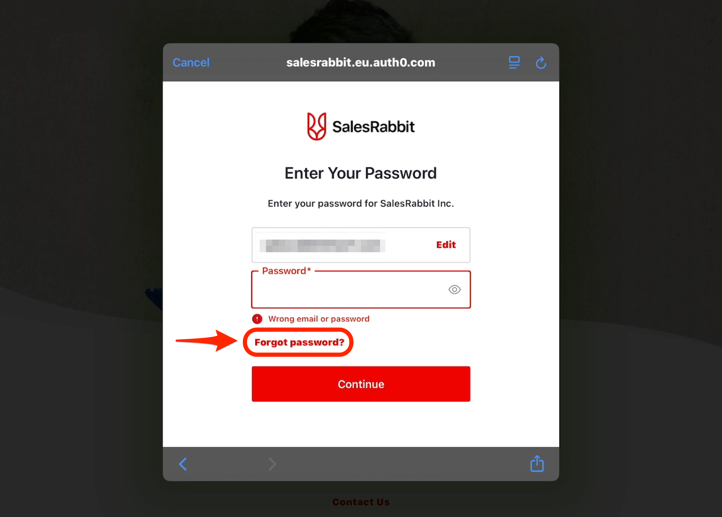 - From the SalesRabbit+ mobile app, if a user's login attempt fails or does not remember their SalesRabbit+ password, click "Forgot Password".