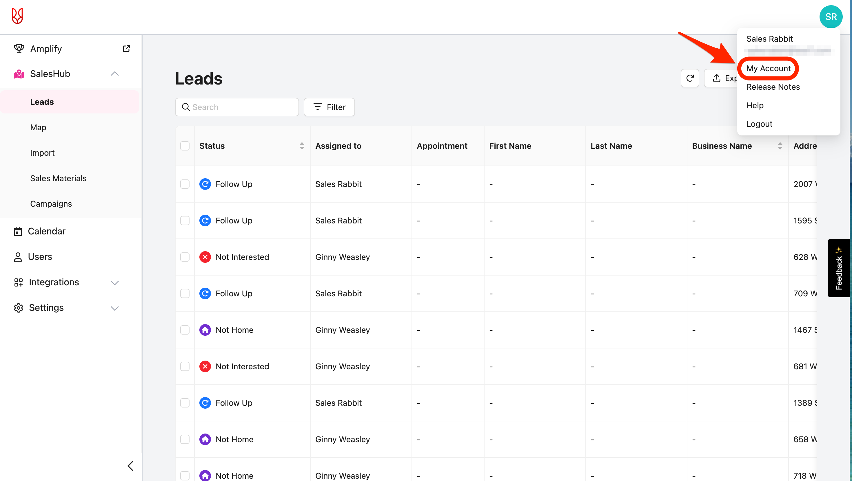 - After logging into the SalesRabbit+ Web App -> click the Profile Icon in the upper right corner -> click the "My Account" button.
