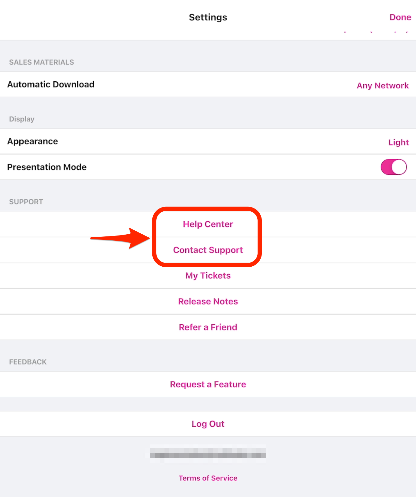 - At the bottom of the mobile app settings, a user will find quick access to contact SalesRabbit Support.