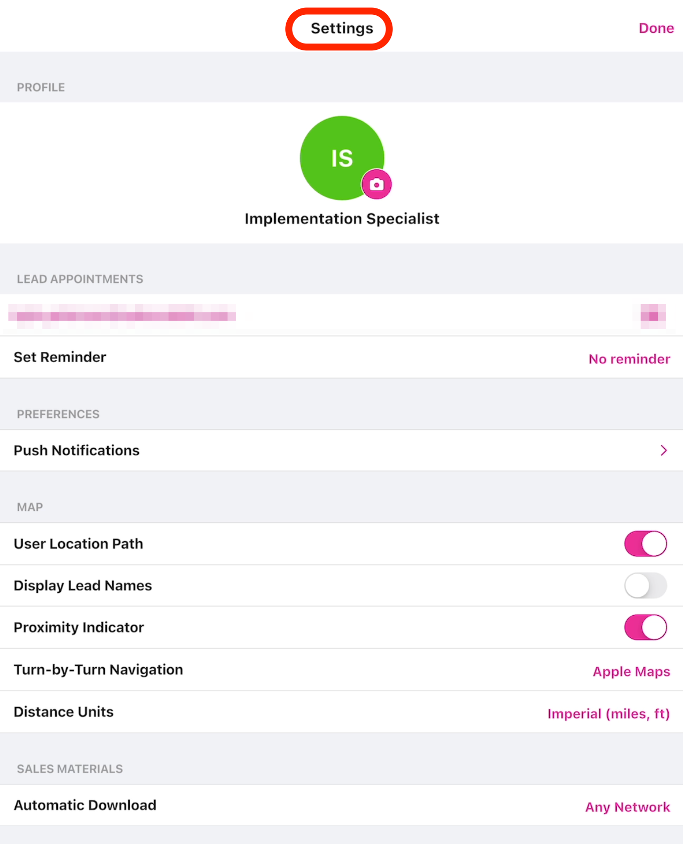 - Under the settings, a user can upload a profile photo, adjust appointment, map, sales materials, and display settings.