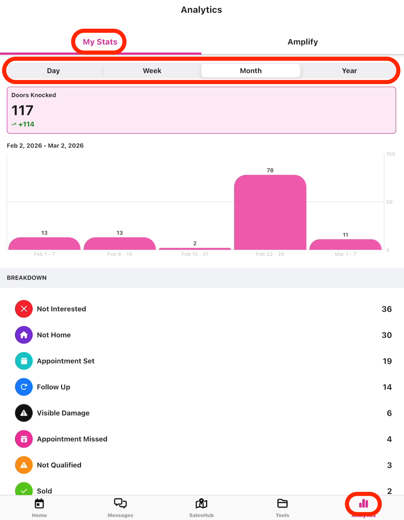 - Users will be able to view a breakdown of the lead status dispositions they have marked by "Day", "Week", "Month", and "Year".