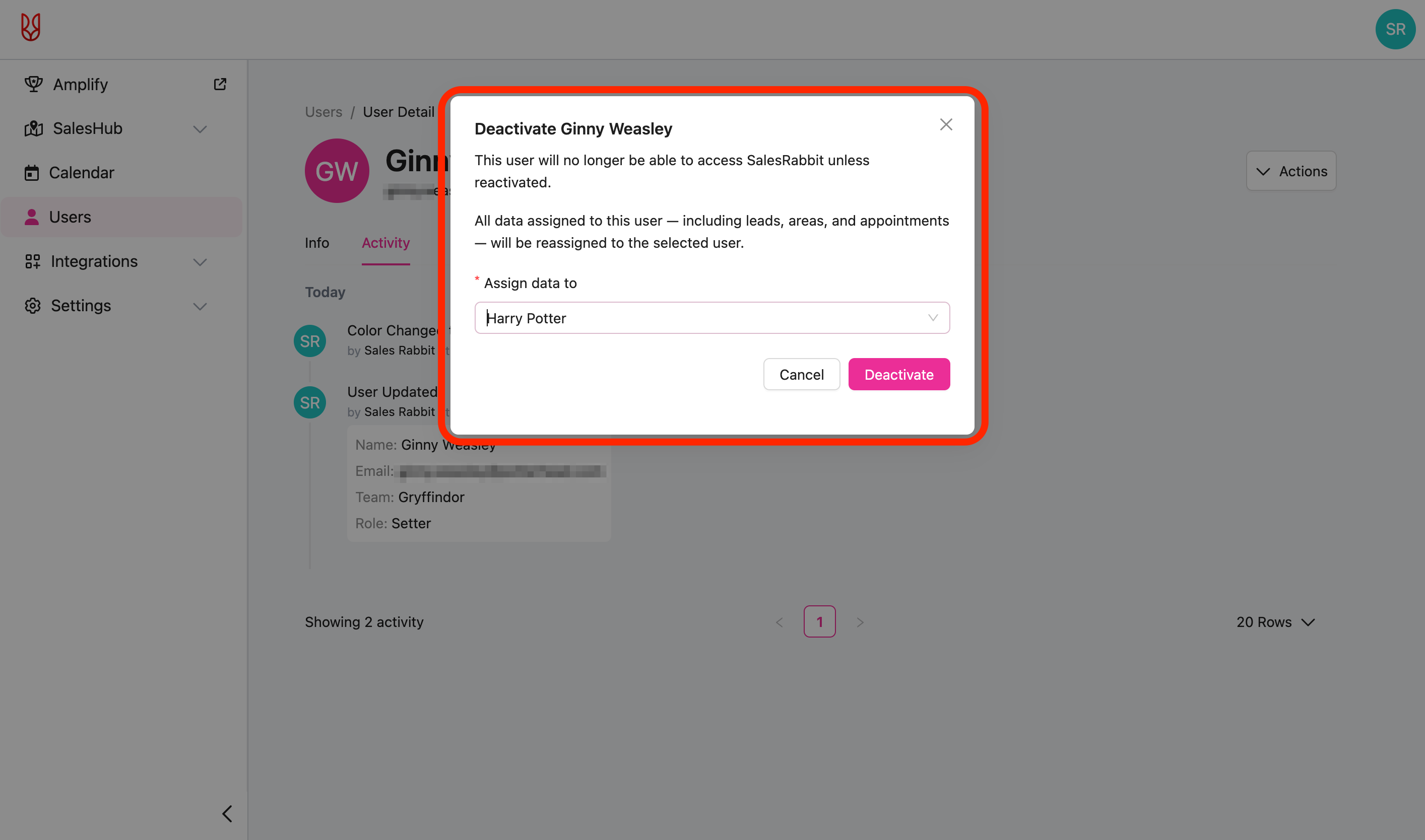 - When deactivating a user, you'll be prompted to assign that user's data to another user. Assign the data -> click "Deactivate".