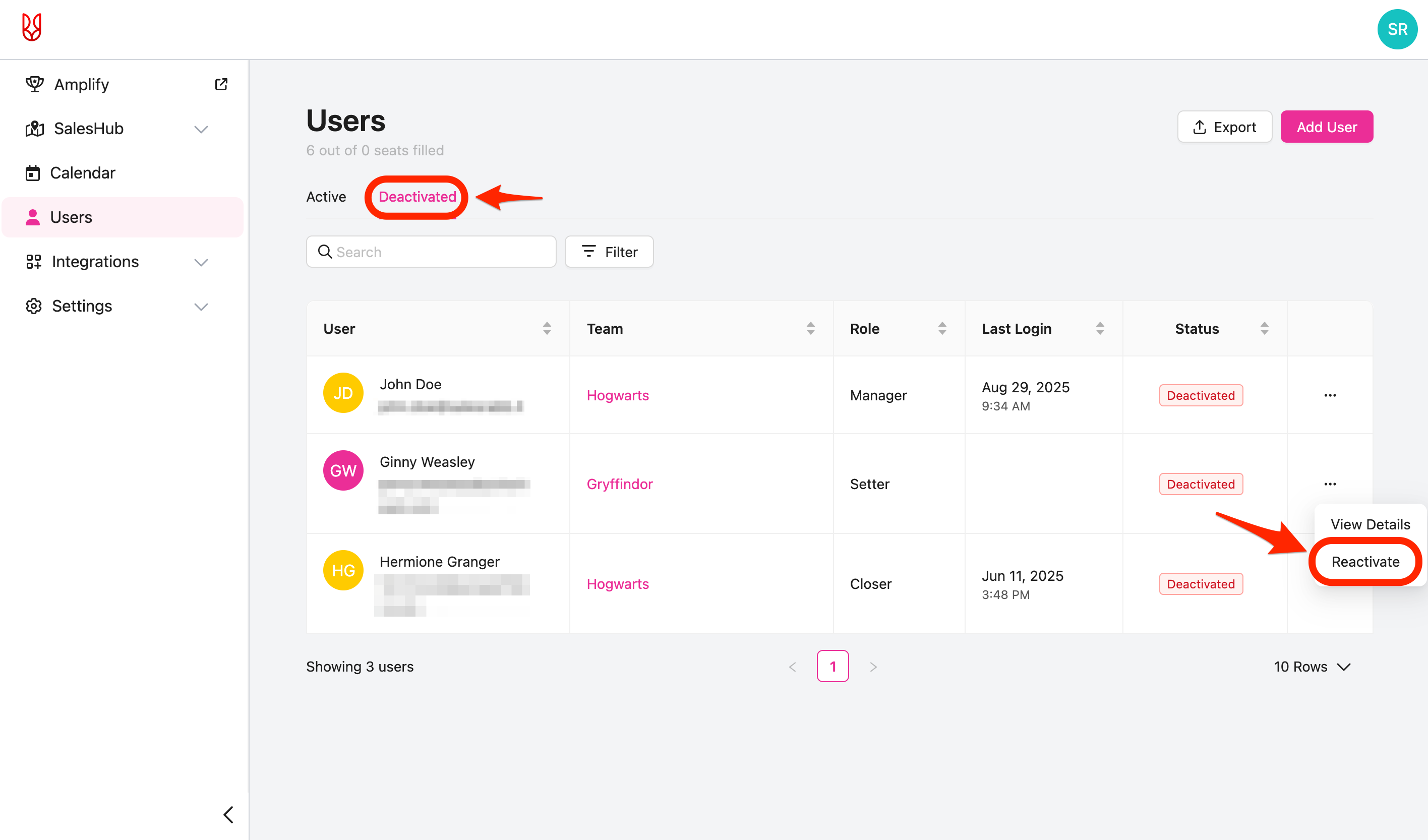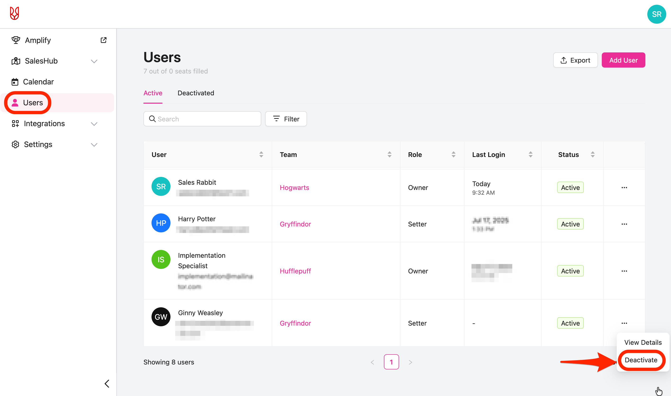 This part will cover how to deactivate a user. Deactivating a user means that user will no longer be able to access SalesRabbit unless reactivated. All data assigned to this user (areas, assignments, leads, etc.) will be reassigned to another user. Deactivating a user also reduces the number of seats/user licenses are being occupied occupied.