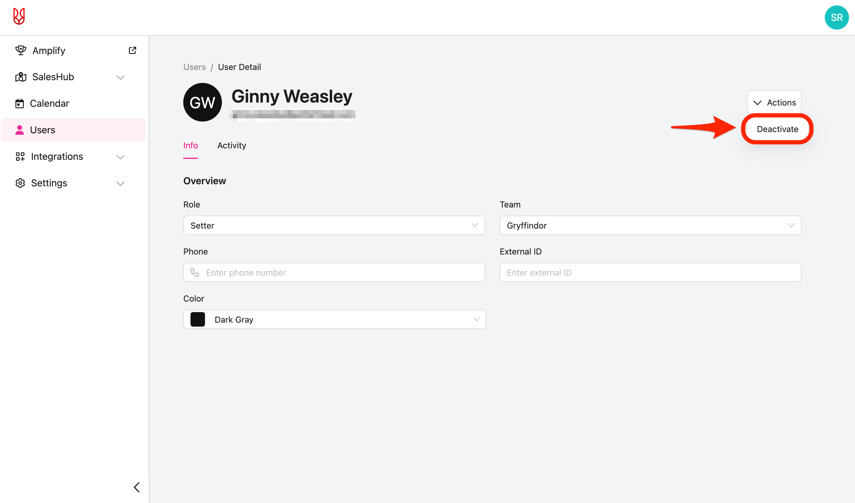 - Alternatively, click "View Details" (or select the user itself) to navigate to that user's detail page -> click the "Actions" button in the upper right hand corner -> select the "Deactivate" option.