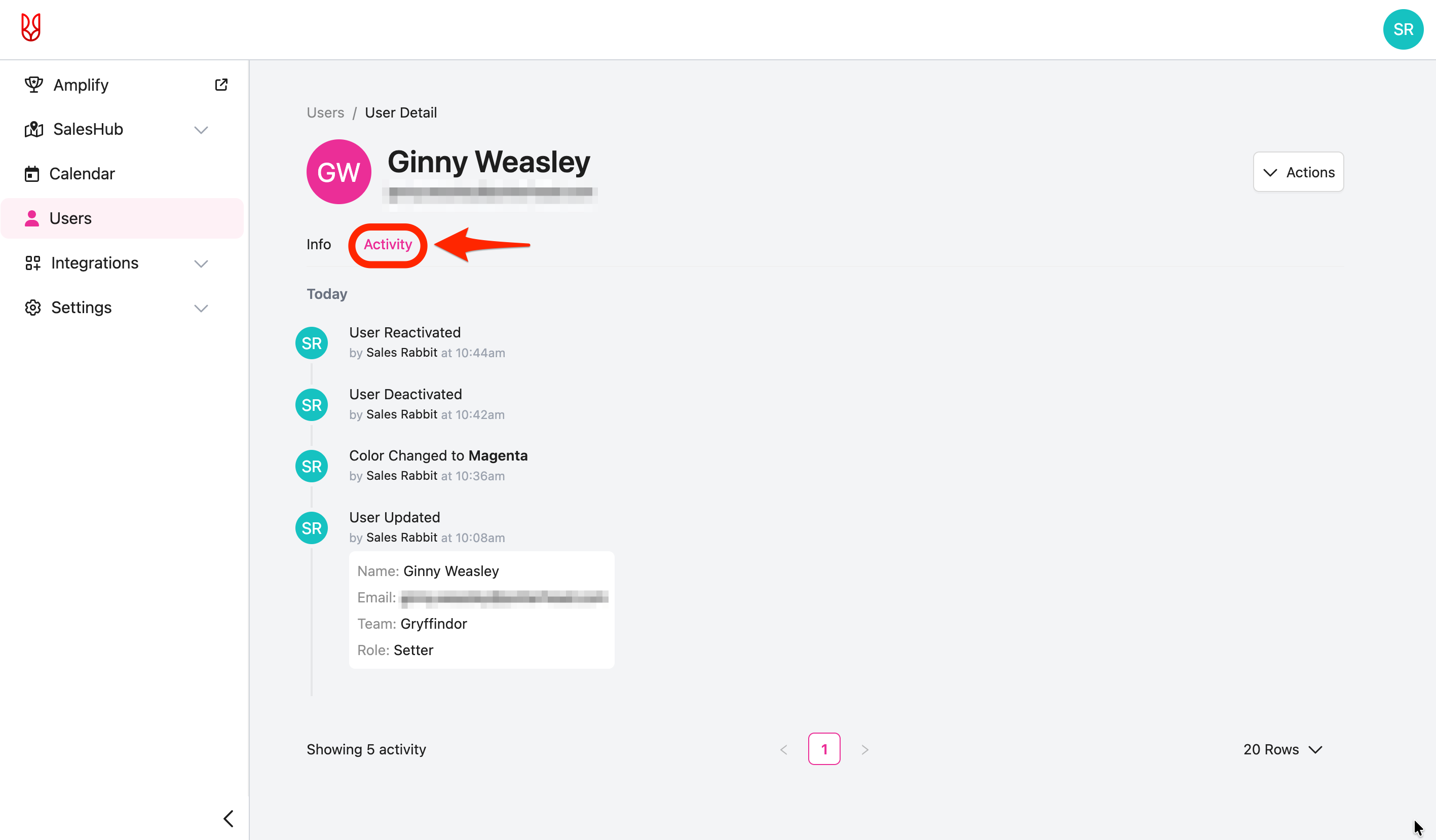 - Additionally, admins are able to view a user's "Activity", a historical log of changes made to that user's information.