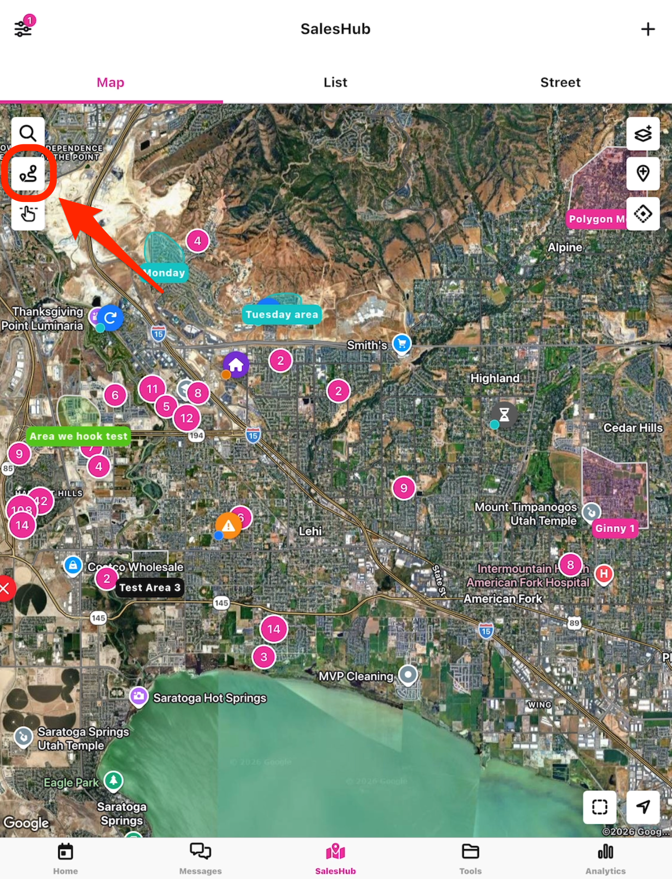 • After logging into the SalesRabbit+ mobile app, navigate to "SalesHub" -> select the double pin "Route" icon in the upper left corner of the map.