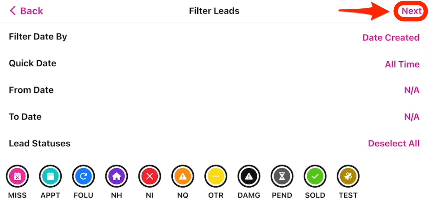 • In the below example, there is no date range applied, but we are searching for leads of a specific status (NH, APPT, FOLU).