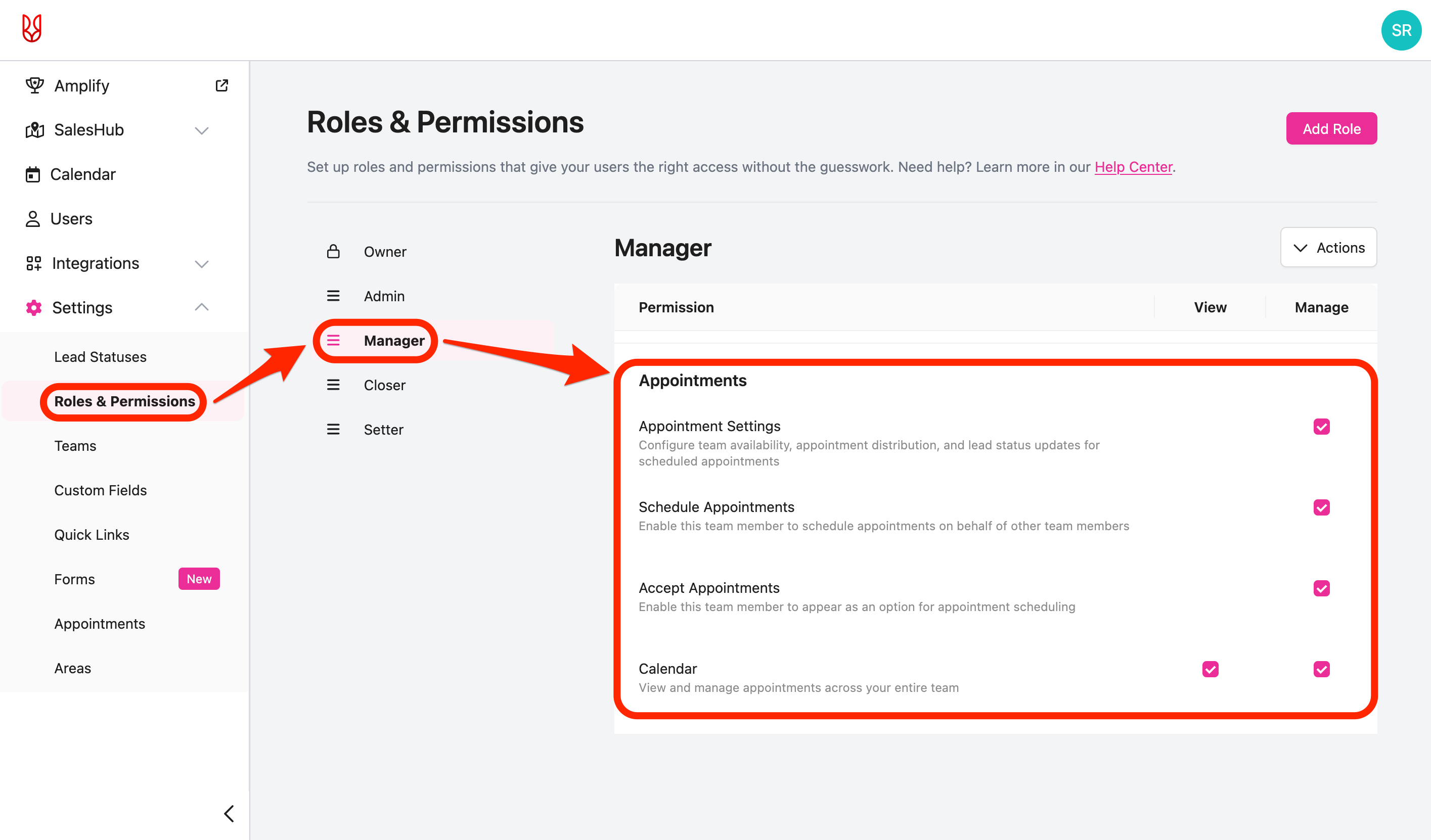 - Navigate to the appointment permissions by selecting "Settings" -> "Roles & Permissions" in the web app -> select the role that you'd like to edit the permissions for.