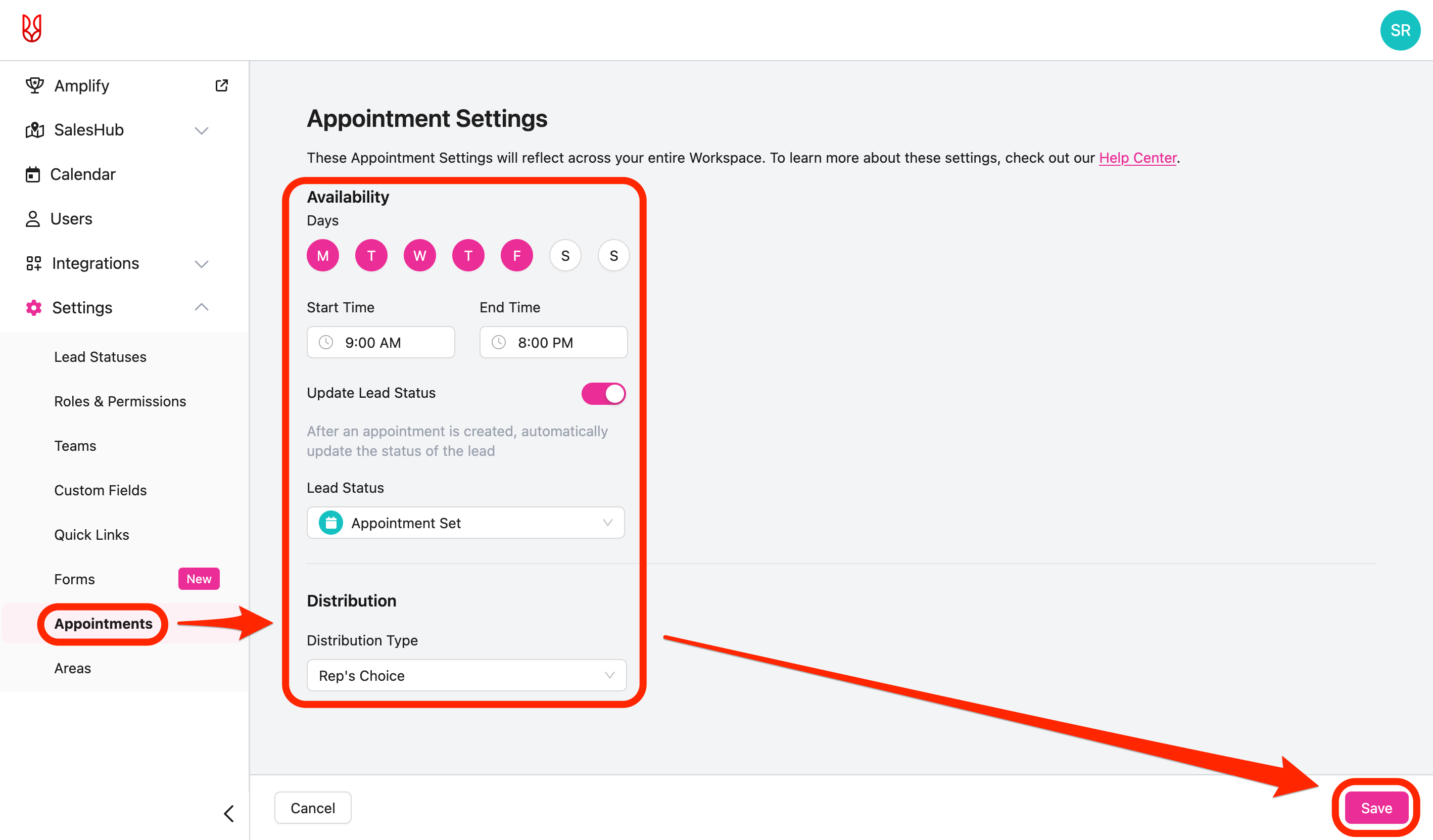 - Allows the team member to configure team availability, appointment distribution, and lead status updates for scheduled appointments.
