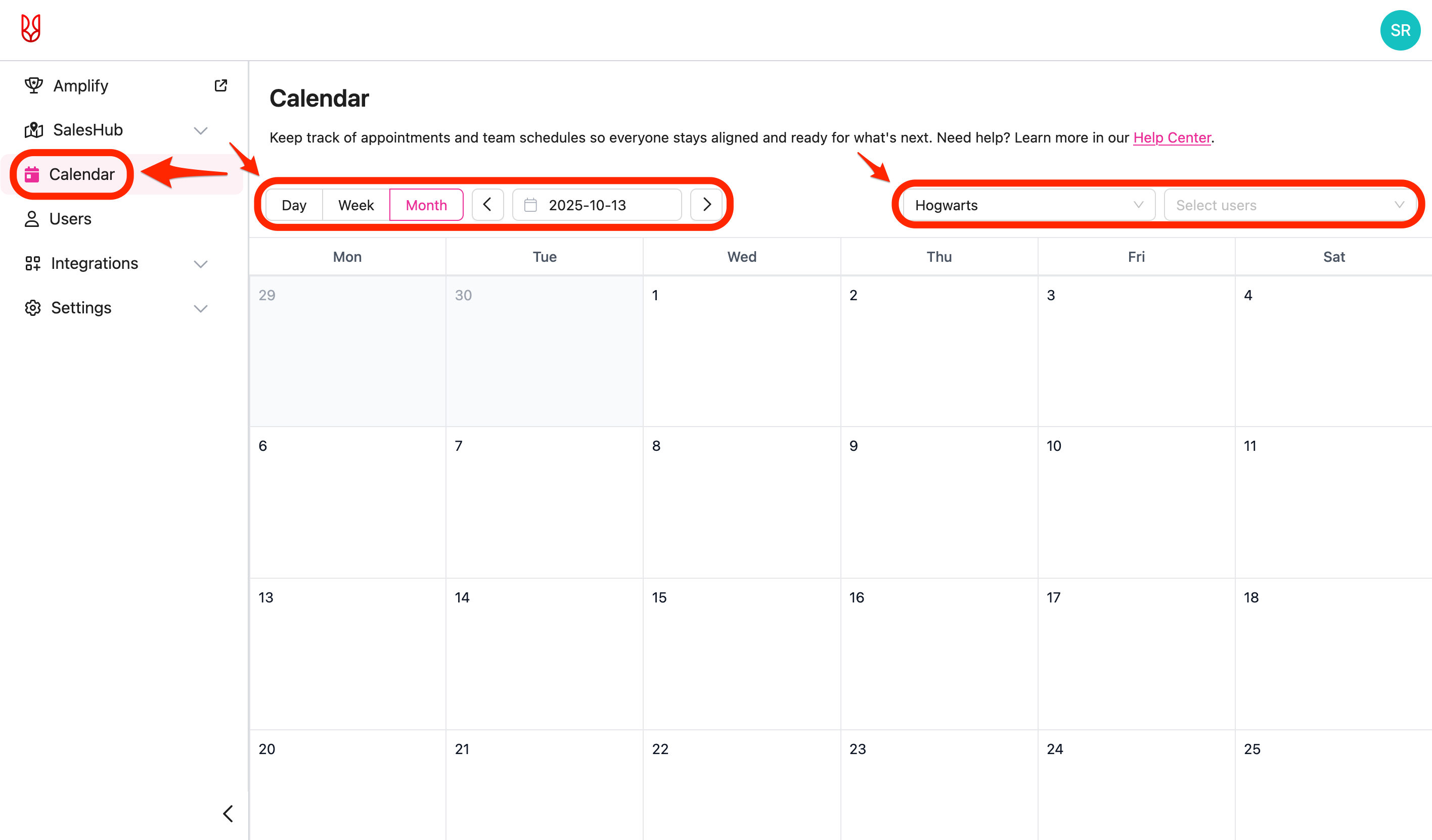 - Navigate to the team calendar by selecting "Calendar" on the web app.