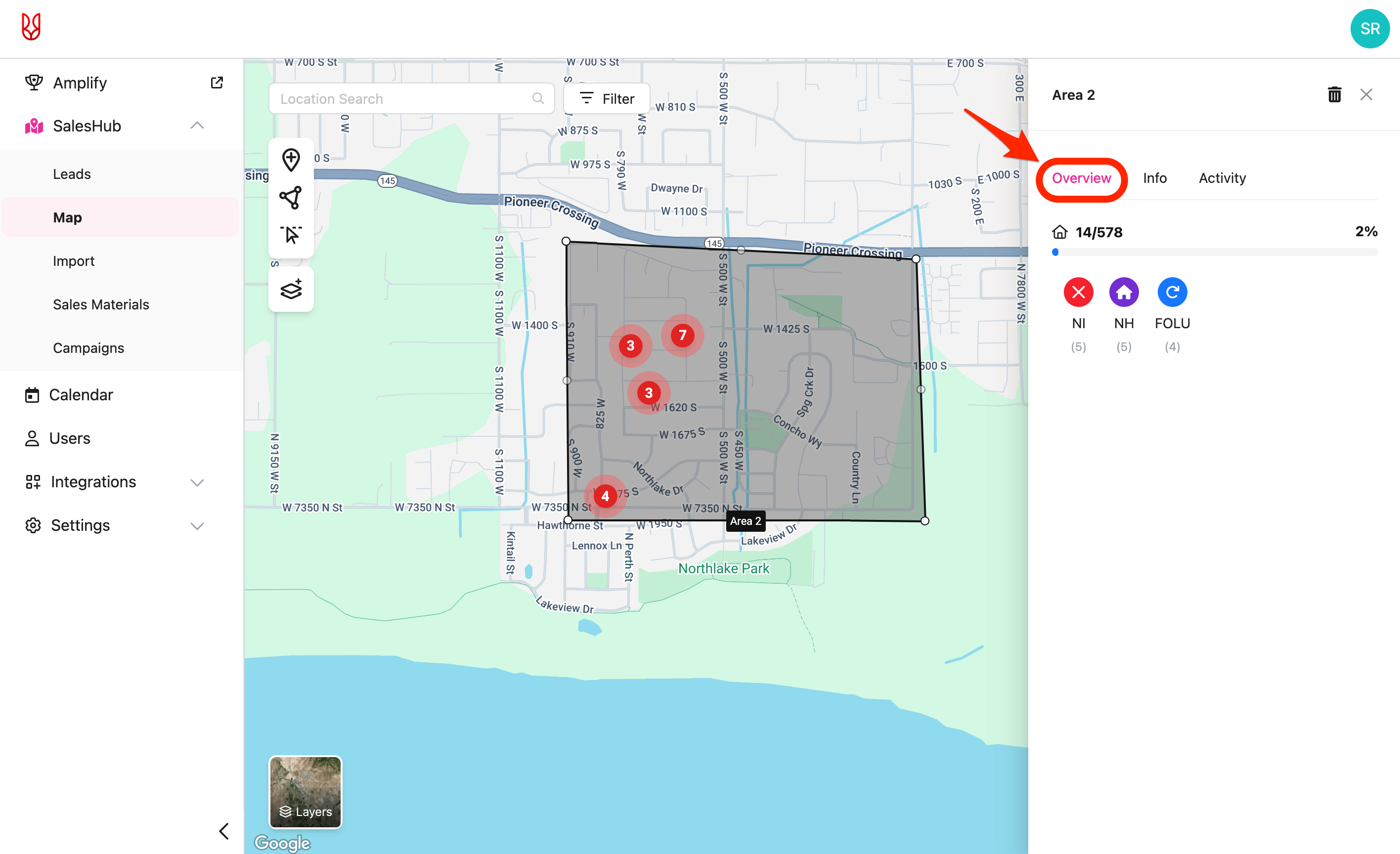 • A menu will appear on the right side, displaying that area's "Overview". The overview contains information on how many leads there are vs. the number of homes existing within the area. Additionally, a breakdown of how many leads of each status existing in the area.