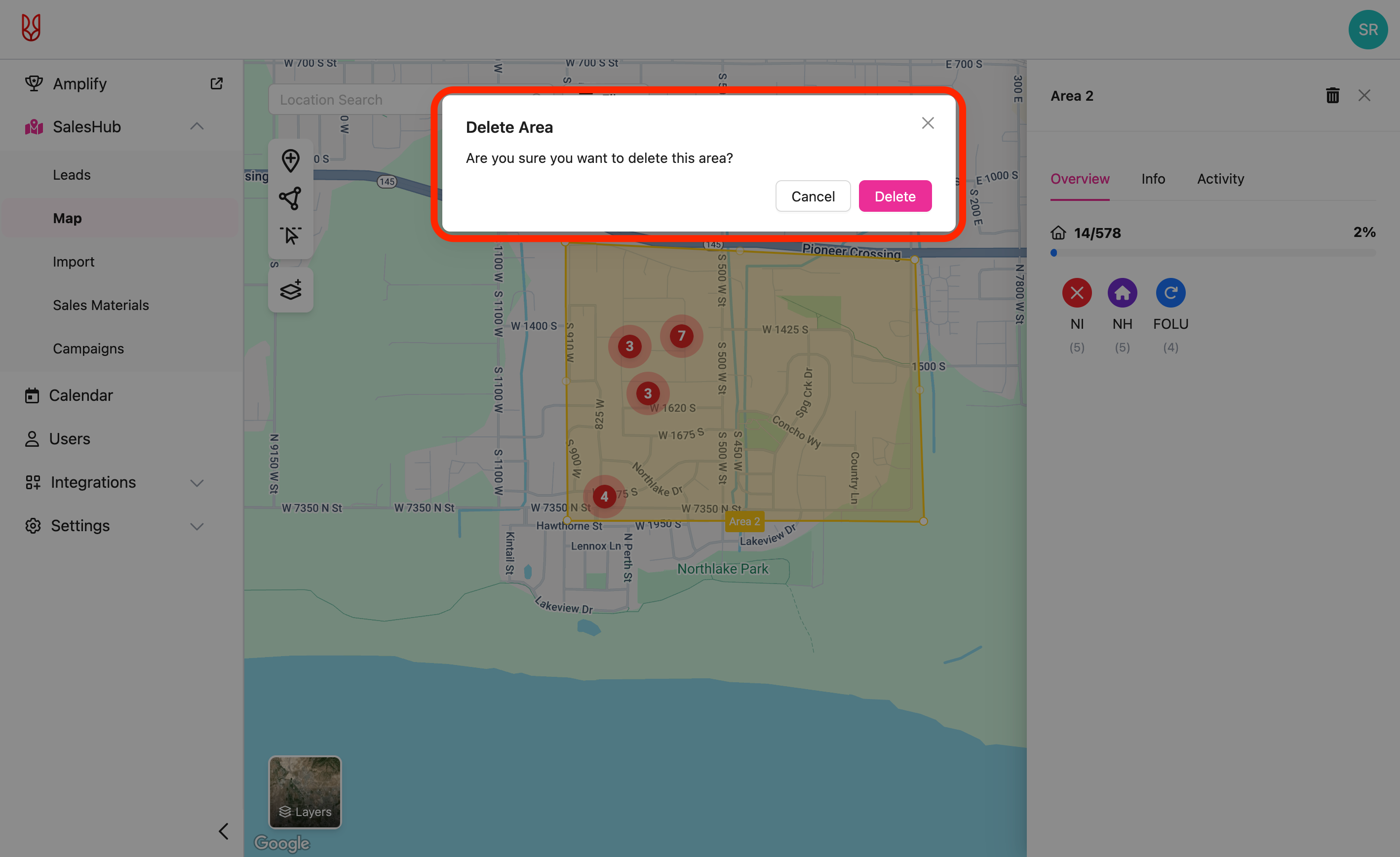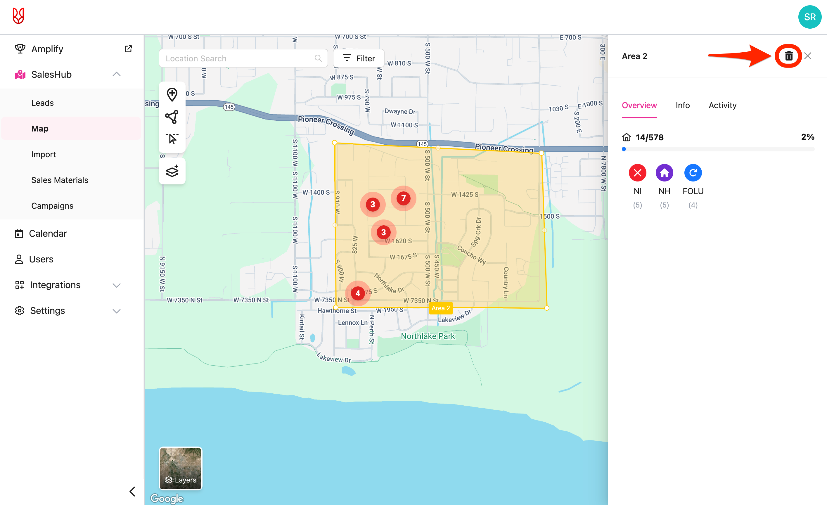 • Deleting an area will only delete the drawn boundaries. Lead information is not deleted.