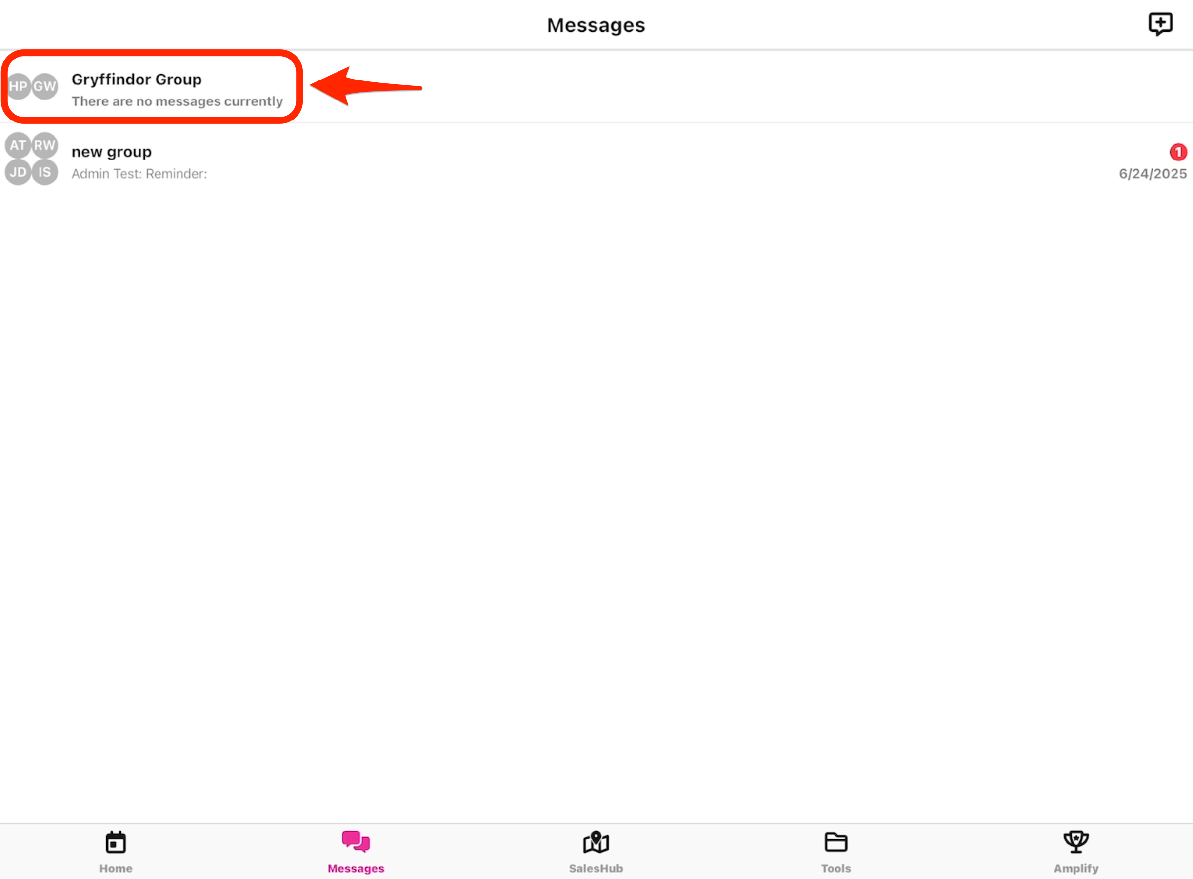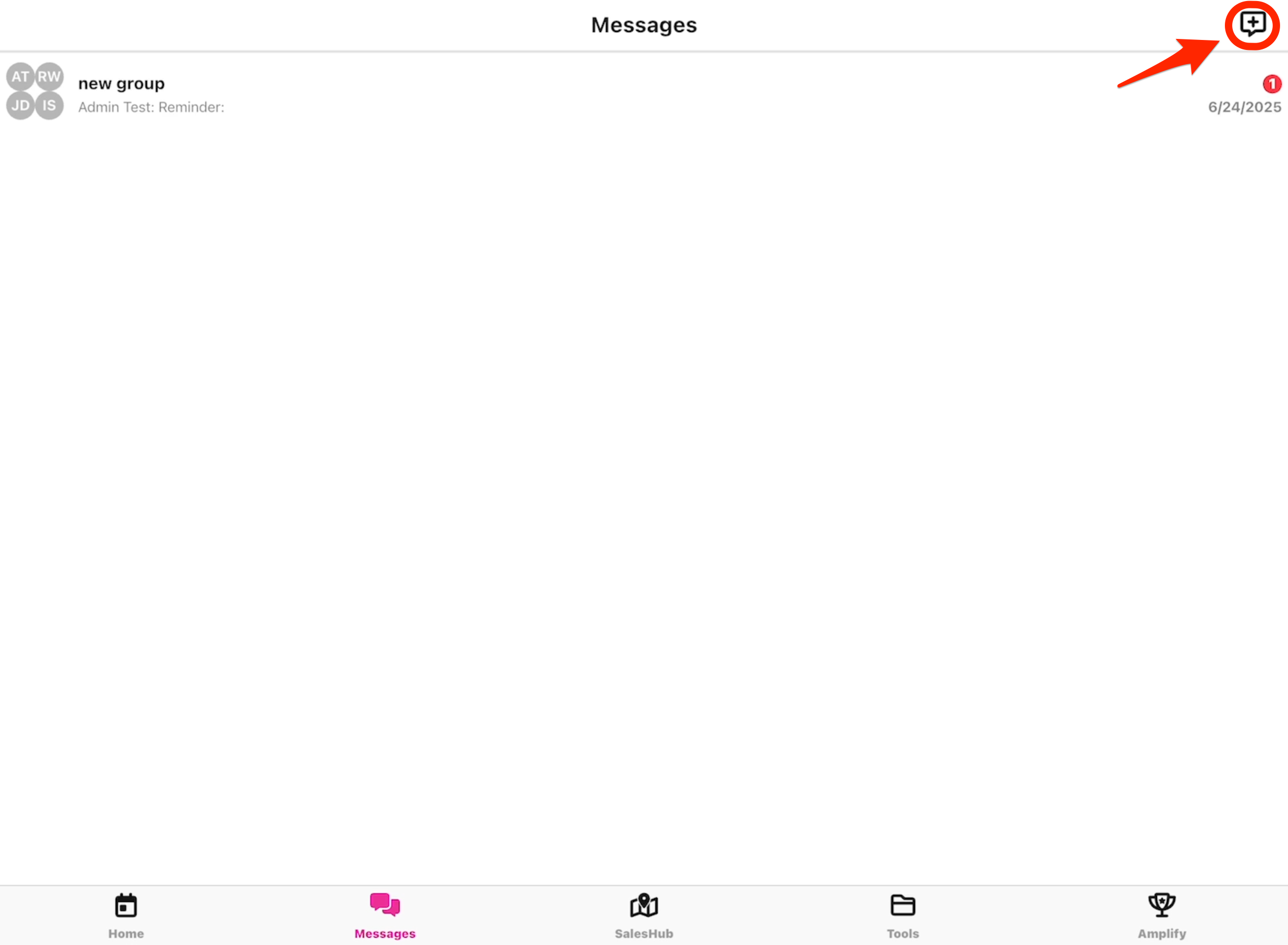 - To create a new group message, click the "+" icon in the upper right corner.