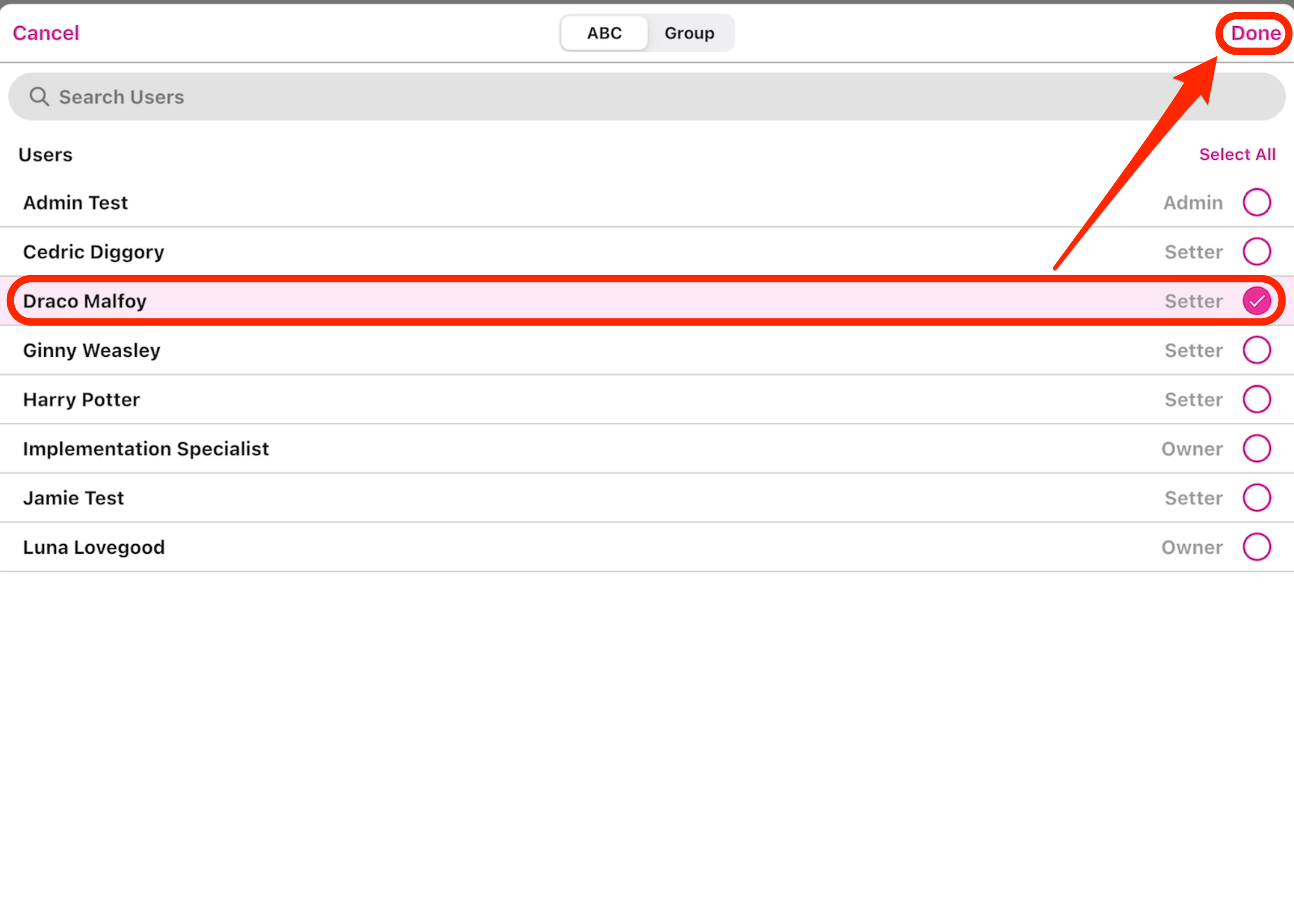 - Select the user you'd like to send a message to -> click "Done".