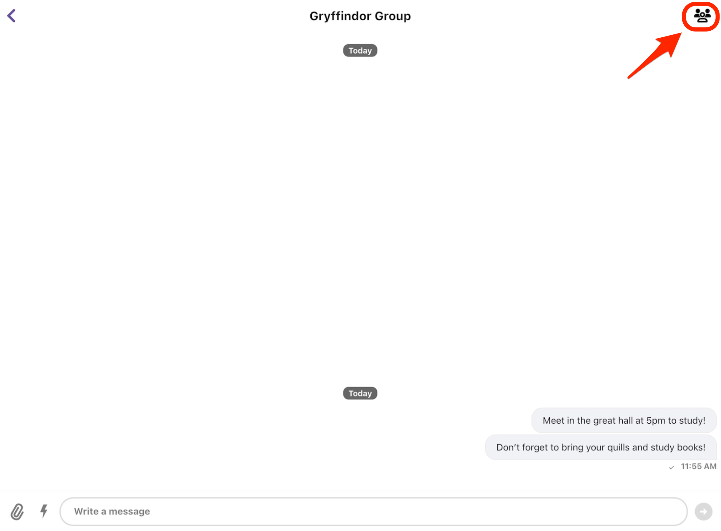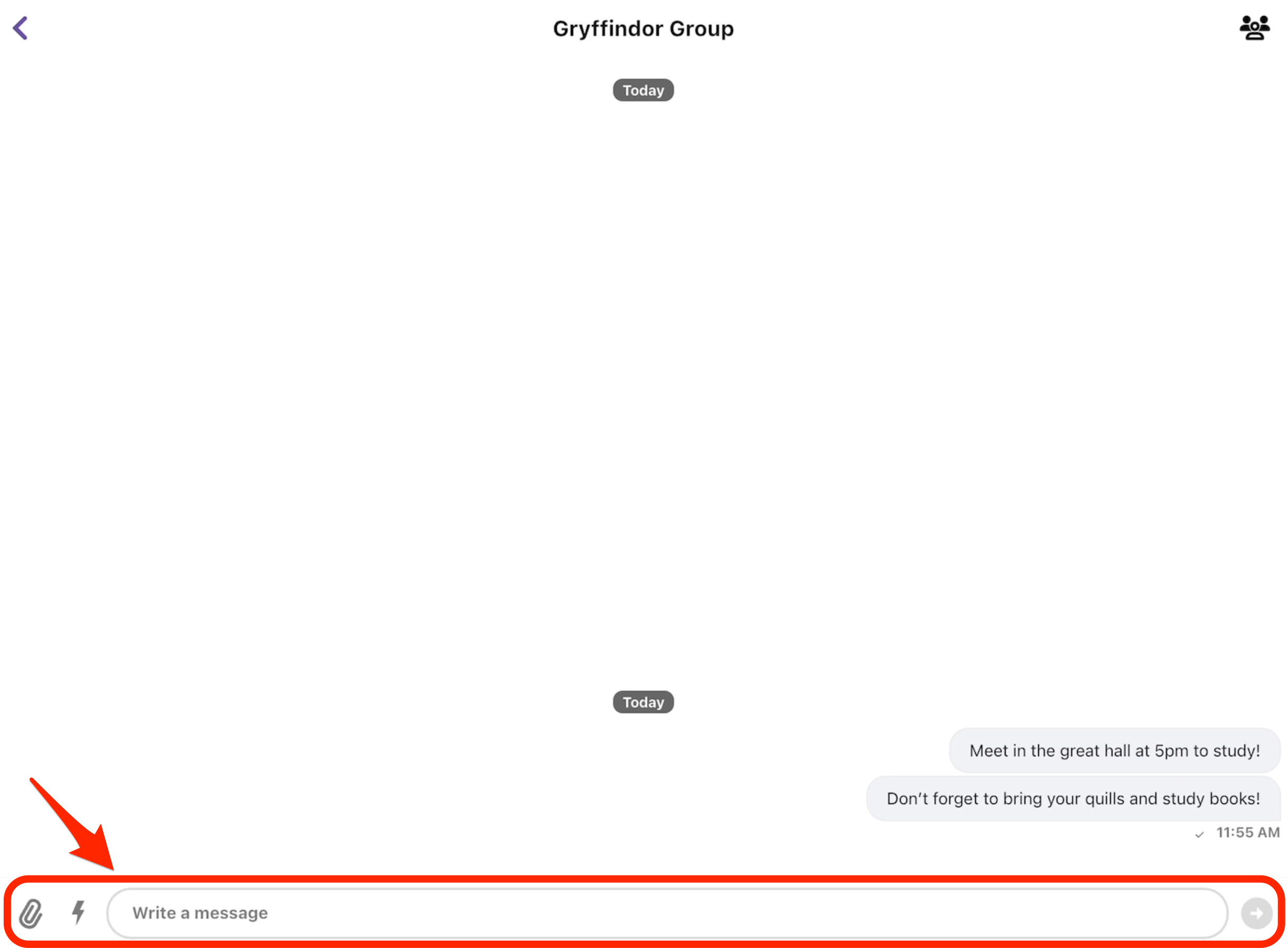 - Use the "Write a Message" text box to draft and send messages to the group. Additionally, include attachment and Gifs with the icons to the left of the text box.