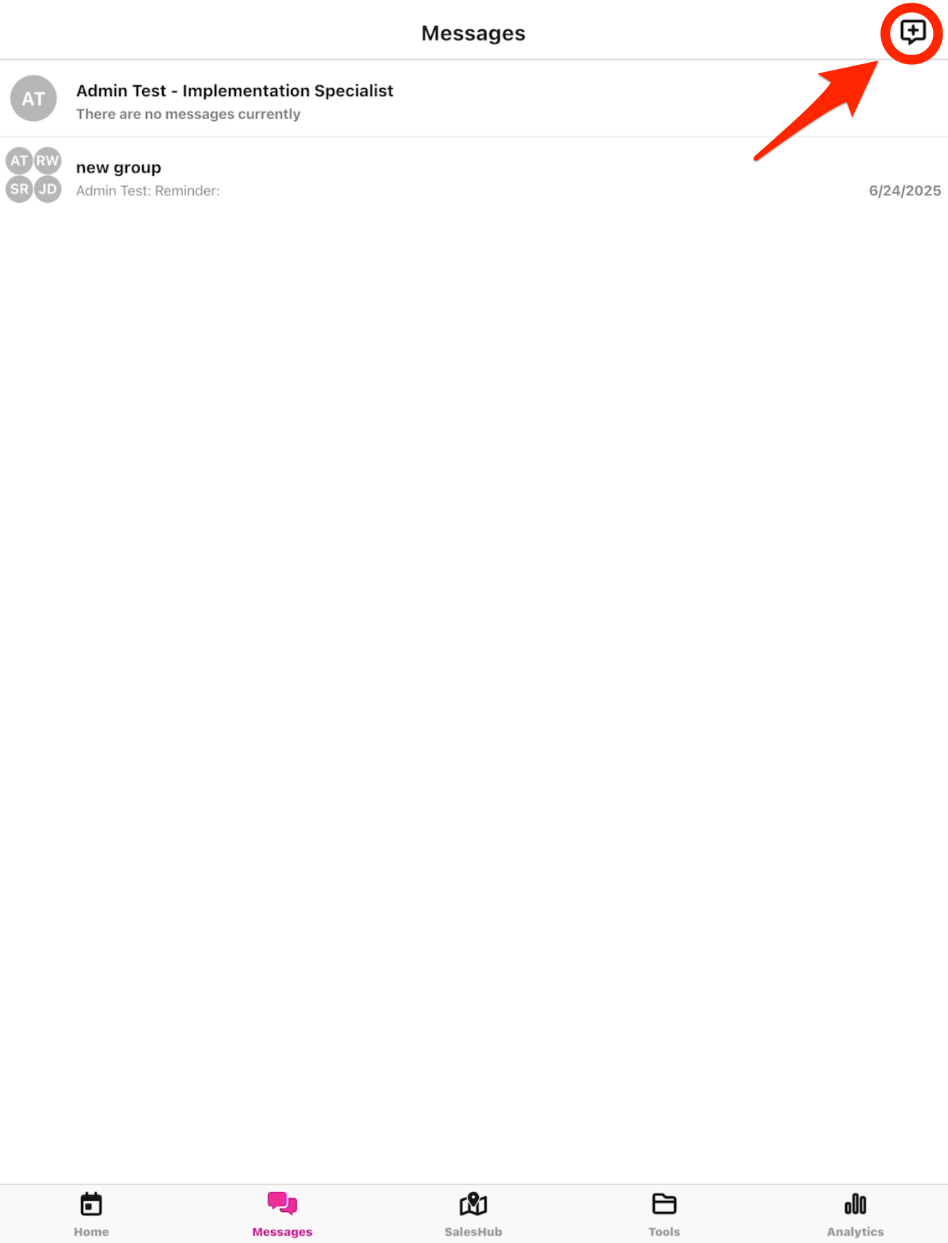 • To create a new group message, click the "+" icon in the upper right corner.
