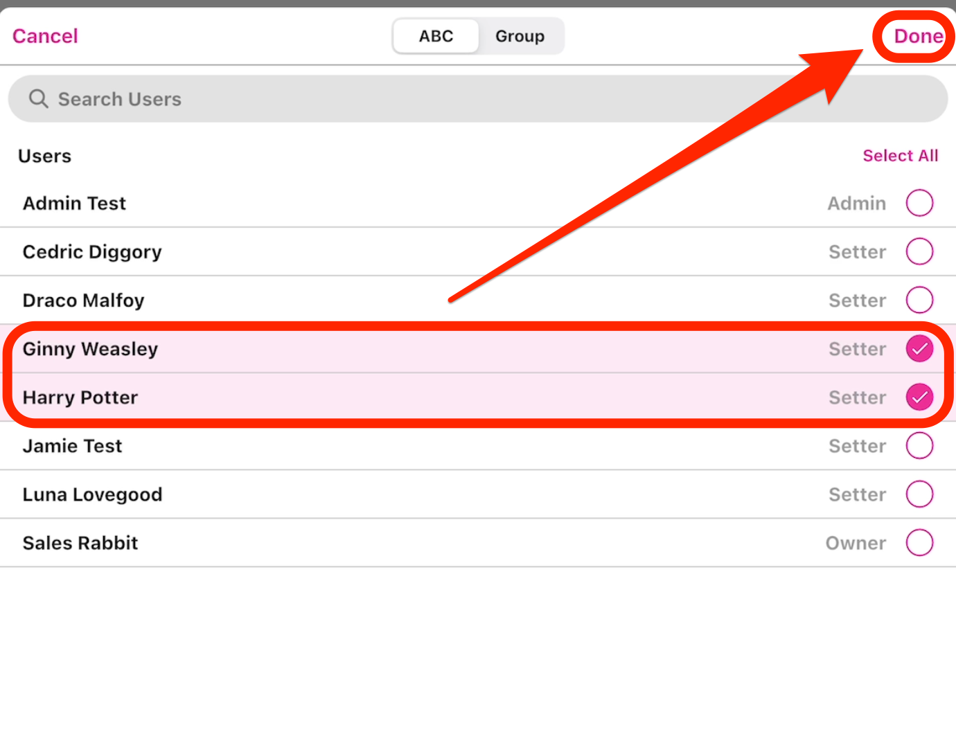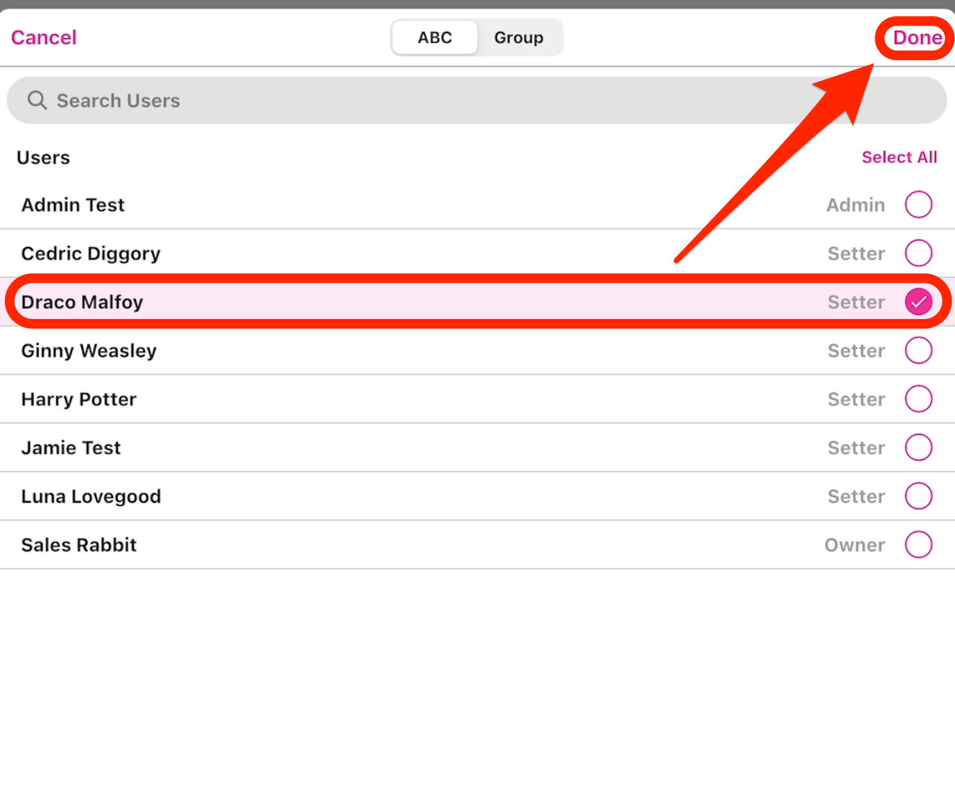 • Select the user you'd like to send a message to -> click "Done".