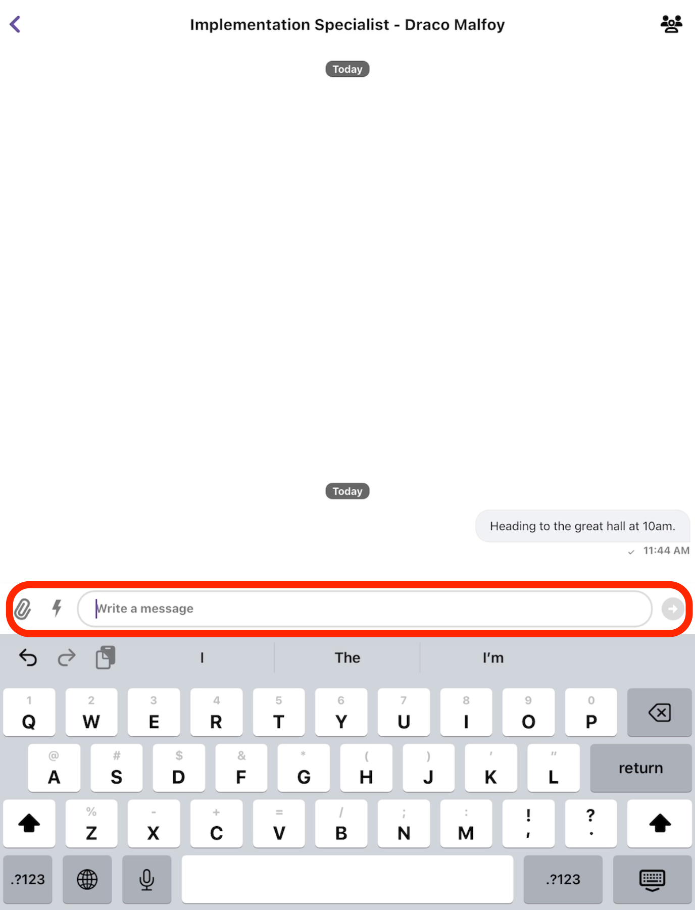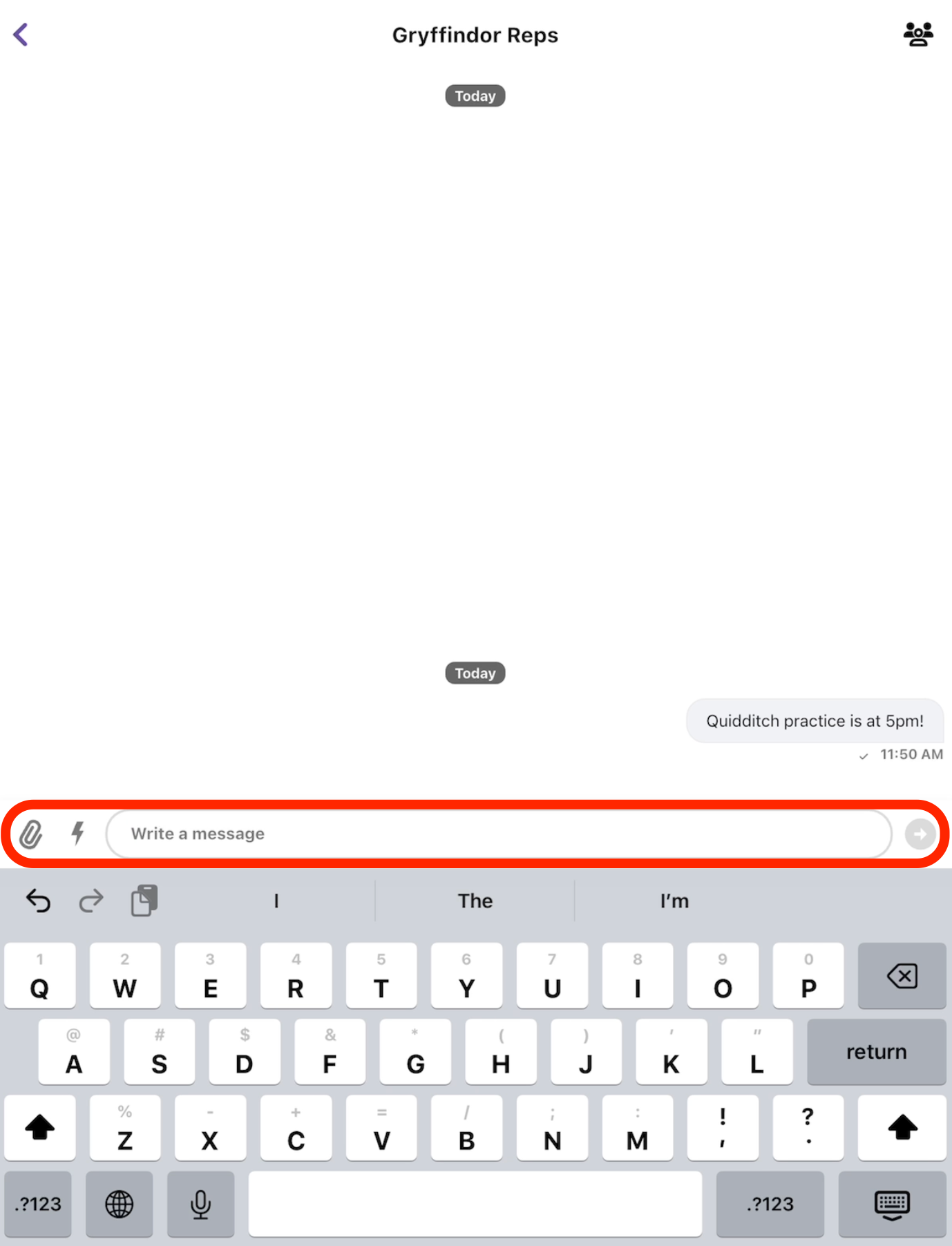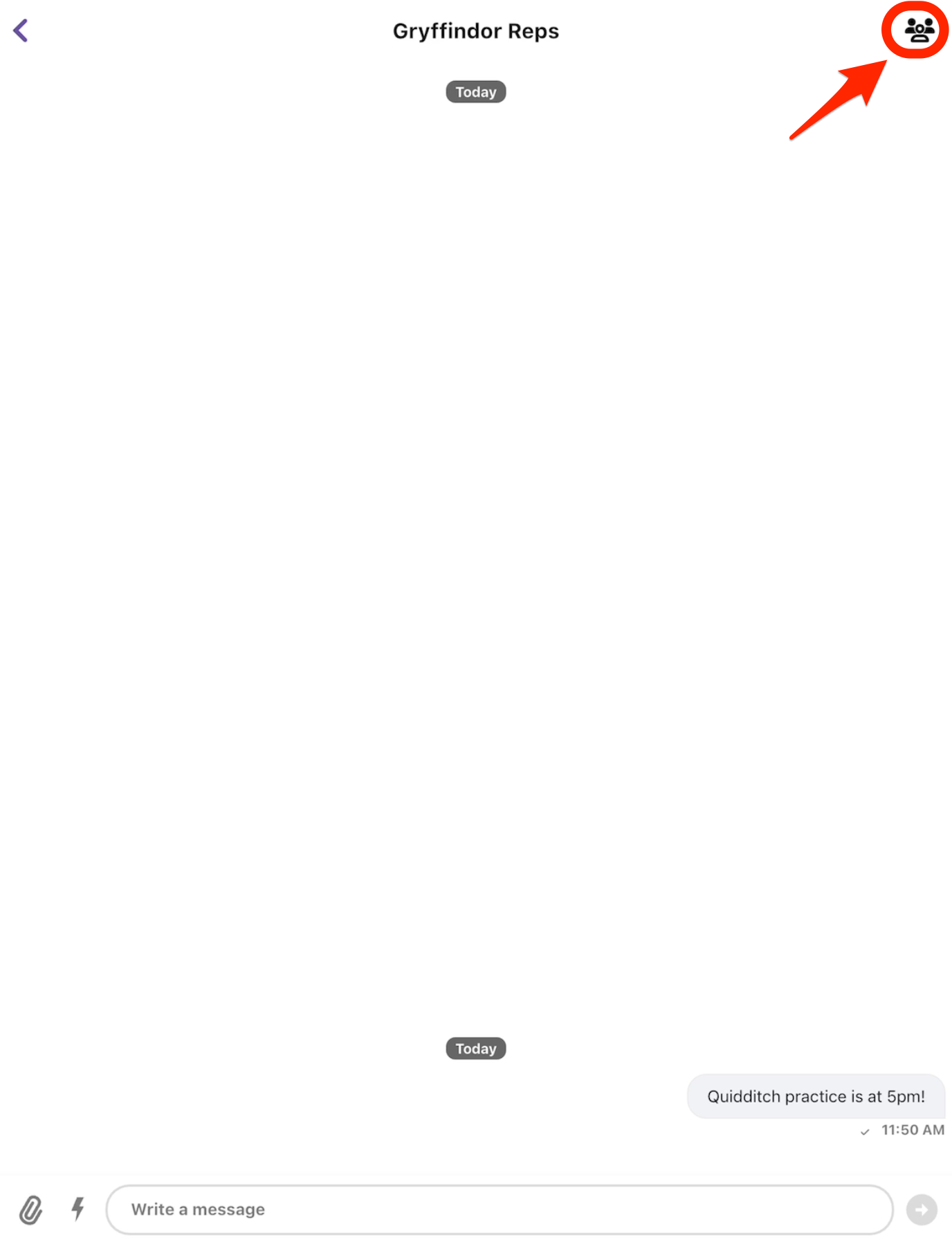 • Use the "Write a Message" text box to draft and send messages to the group. Additionally, include attachment and Gifs with the icons to the left of the text box.