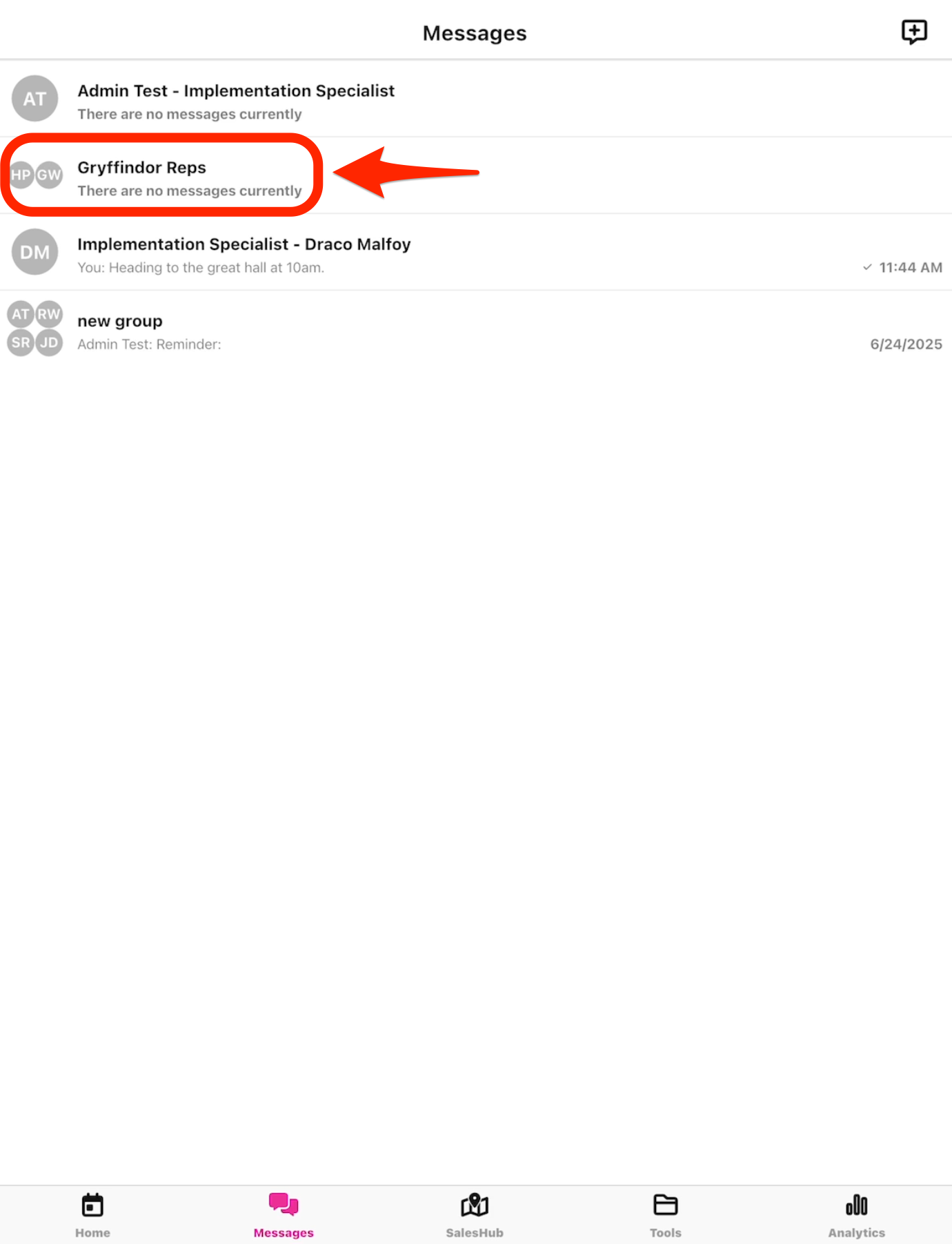 Users are able to messages to other users from the SalesRabbit+ mobile app. In order for a user to appear as an option to message, that user must have an active user in the SalesRabbit+ workspace and they MUST navigate to the "Messages" tab in the mobile app at least once. Users will not be able to receive a message until they've completed this task.