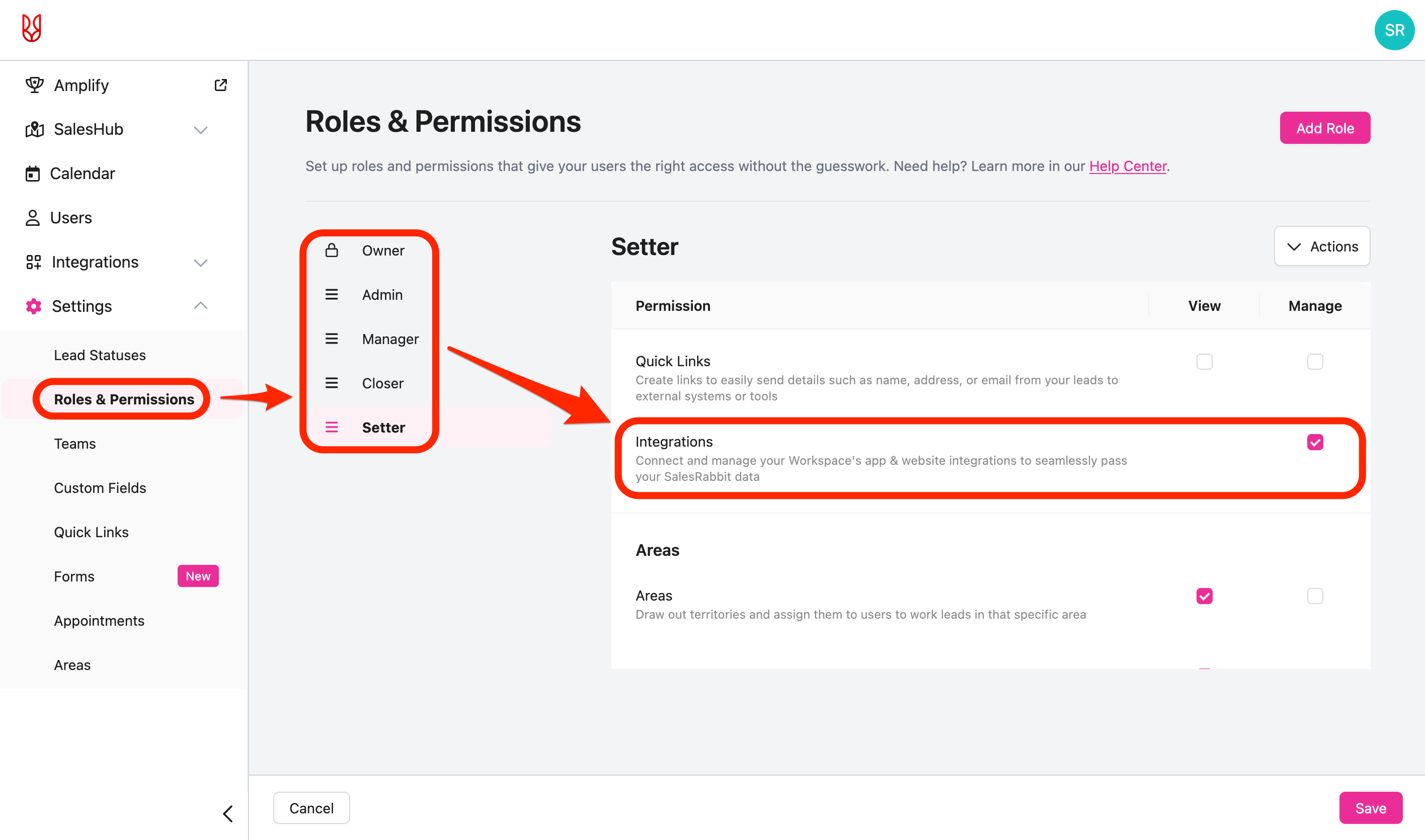 - Select the role you'd like to edit -> ensure the "Integrations" permission is enabled.